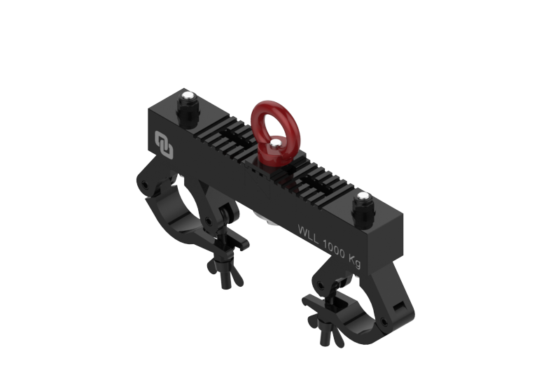 Susp ension bracket with double adjustable clamp for secure fastening to trusses or tubes. Equipped with a high-capacity central eye bolt, repositionable thanks to the upper slot, it provides flexibility of use and optimal load distribution.