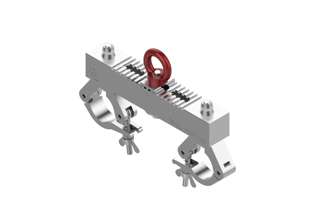Staffa di sospensione con doppio clamp regolabile per il fissaggio sicuro a tralicci o tubi. Dotata di golfare centrale ad alta portata, riposizionabile grazie alla scanalatura superiore, offre flessibilità d’uso e distribuzione ottimale del carico.